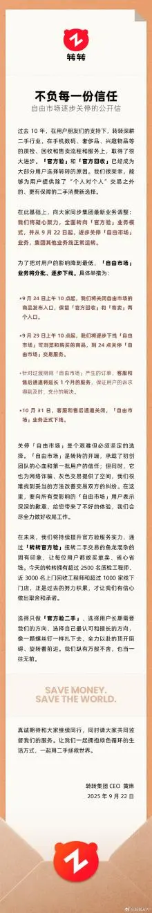 在9月22日的官方公告中,转转确认将从公告发布日起分批、逐步下线“自由市场”业务,并预计该业务将在10月31日正式下线。