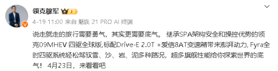 领克官方宣布,旗下领克09 mhev四驱全球版将于4月23日上市,新车提供7座布局,并新增名为“深海蓝”的全新车色。而目前在售的领克09(不含领克09 em-p)共有3款配置,指导价23.79万-25.79万元。
