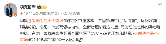 和领克09mhev相比,新车提供7座版本、新增“深海蓝”车色、标配20英寸轮毂、车内采用一体式高级棕内饰以及全新物理按键方向盘,座椅、音响、香氛等继承在售车型的用料配置。