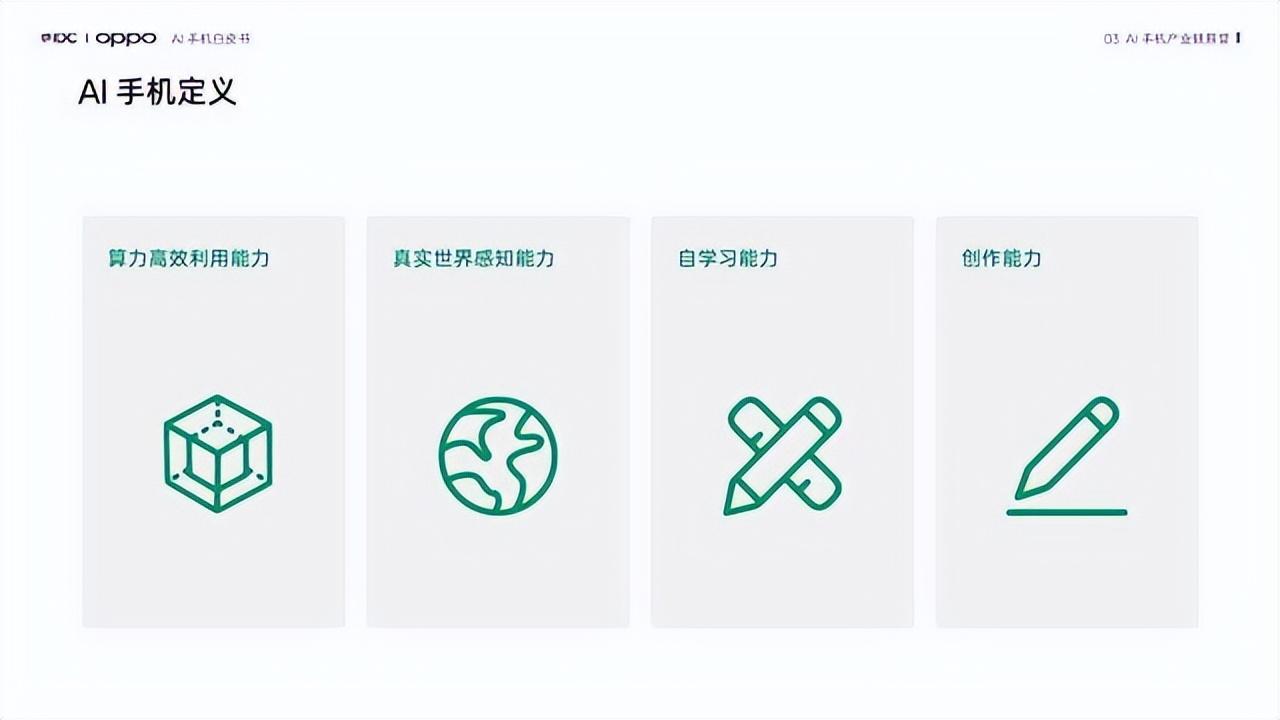 2024年2月20日,idc和oppo联合发布了《ai手机白皮书》,提出了新时代ai手机需要具备四种能力:算力高效能力、真实世界感知能力、自学习能力和创作能力。简单说,ai手机就是具备高效算力利用能力、真实世界感知能力和自学习能力的设备,标志着手机全栈革新和生态重构的开始。