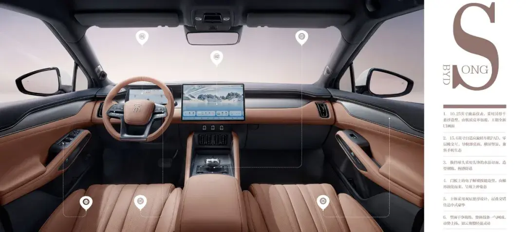 “动势” 是对“先锋设计”的再次探索,根据人的视觉运动线路,营造整体内饰构造的动势感,使宋l整体内饰随势而动。环抱式座舱的“交错”灵感源于中国结,由中控台为轴形成对称设计,线条优雅交错,线条从主仪表台延续到门板及侧围,形成环绕之态,中控面板双层阶梯式上扬,层次感丰富。这样通过线条的有序穿插,形成简约大气的内饰形体,彰显了“东方美学”对和谐、平衡和整体性的追求。“动势交错美学”让宋l的内饰实现了静中有动、动而不躁的和谐统一,加之众多领先配置,创造出视觉、触觉、嗅觉及听觉等多重感官的愉悦体验。