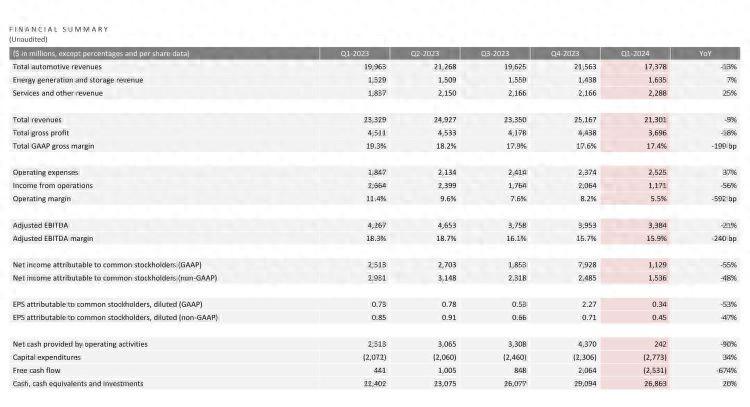 京时间4月24日,特斯拉发布2024年一季度财报。数据显示,特斯拉一季度实现营收213.01亿美元,同比下滑9%;净利润为11.29亿美元,同比下滑55%。