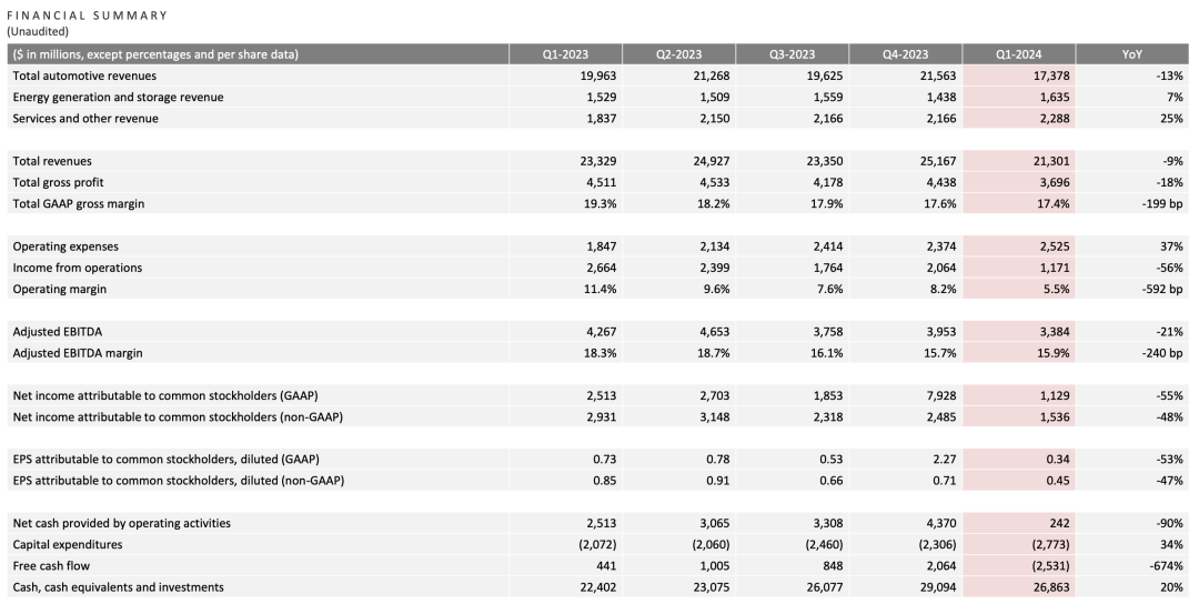 4月23日美股盘后,特斯拉发布2024年一季度财报。数据显示,2024年一季度特斯拉公司营业收入为213.01亿美元,同比下滑8.69%,环比下滑15.36%,低于市场预期,同时是自2020年以来首次在营业收入上同比下滑,也是2012年以来最大降幅。利润方面,特斯拉的表现更加不乐观,一季度净利润仅11.3亿美元,同比下滑55.07%,低于市场预期的19亿美元。报告期内,特斯拉的毛利率为17.4%,上季度为17.6%,同期为19.3%。