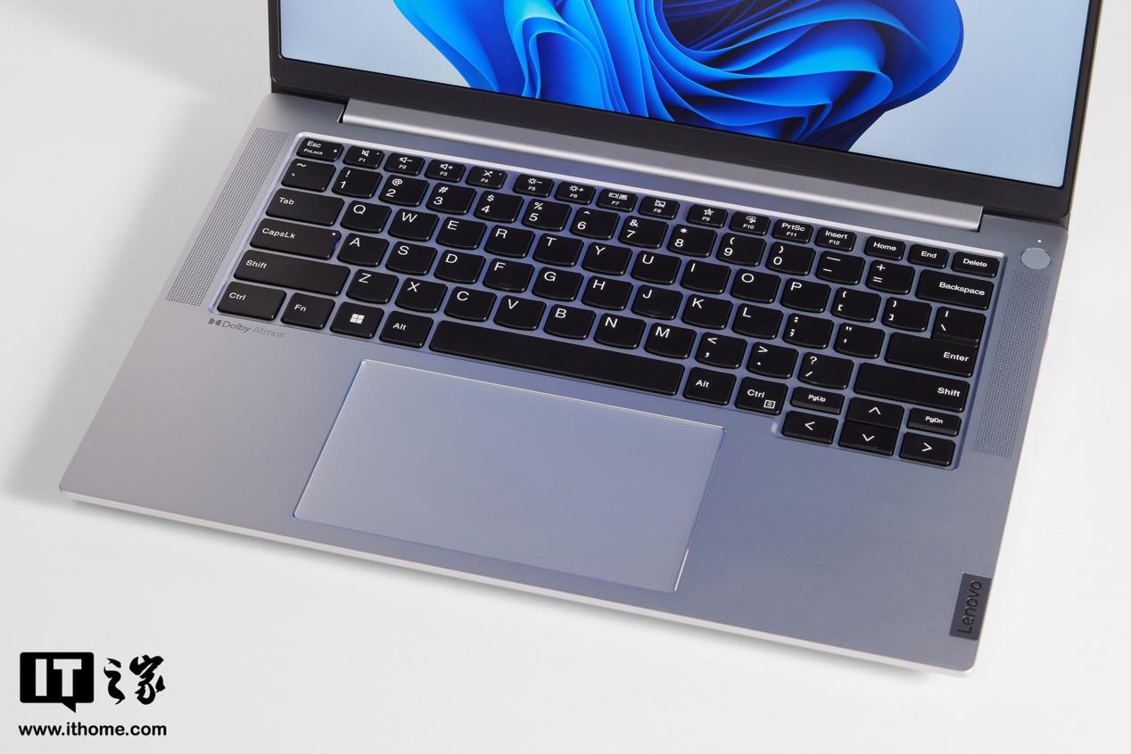 机器 c 面采用了联想标志性的键盘布局,弧形微笑键帽,下凹独立方向键,还可选配背光功能键盘。触控板位置居中,面积较大,表面采用光滑金属材质处理。